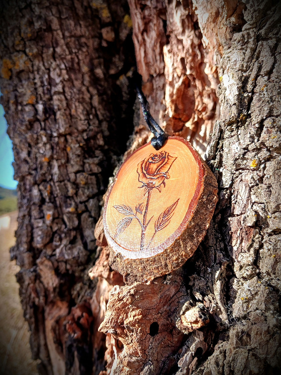 Créations sur tranches de bois, galets en bois, pendentifs, marque-pages, impressions de dessins.
